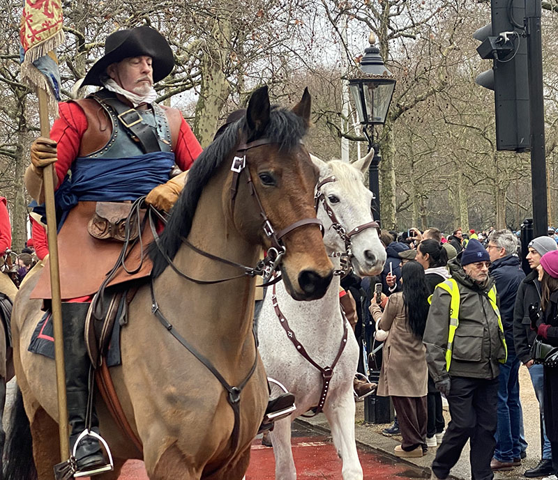 The march and ceremony take place down the Mall and into Horse Guards Parade – three regiments of the king’s army, three extremely squeaky guns, three horses and a suitable number of camp followers – all intensely serious as befits the occasion. Once arrived in Horseguards Parade, the regiments assemble, a lengthy oath of loyalty is sworn, followed by an equally lengthy prayer, a brave if slightly painful interlude with a tin whistle (my musical excuse for including the event) and a long drum roll, doffing of hats and presentation of pikes which I assume commemorate the king’s last march to the stage outside the Banqueing House in Whitehall for his beheading.