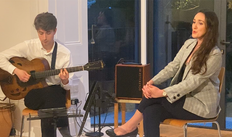 We had the most delightful evening last week with Dani Sicari and James Girling – the ‘pared down’ Easy Rollers! Both Dani and James are classically trained musicians but they are also passionate about jazz – and since 2016 they have had a jazz septet called The Easy Rollers playing jazz festivals and gigs around the country. When I met Dani at the Islington Festival after-party last year and she told me about the Easy Rollers I was lamenting the fact that we could never fit a full septet into Hampstead Lane.